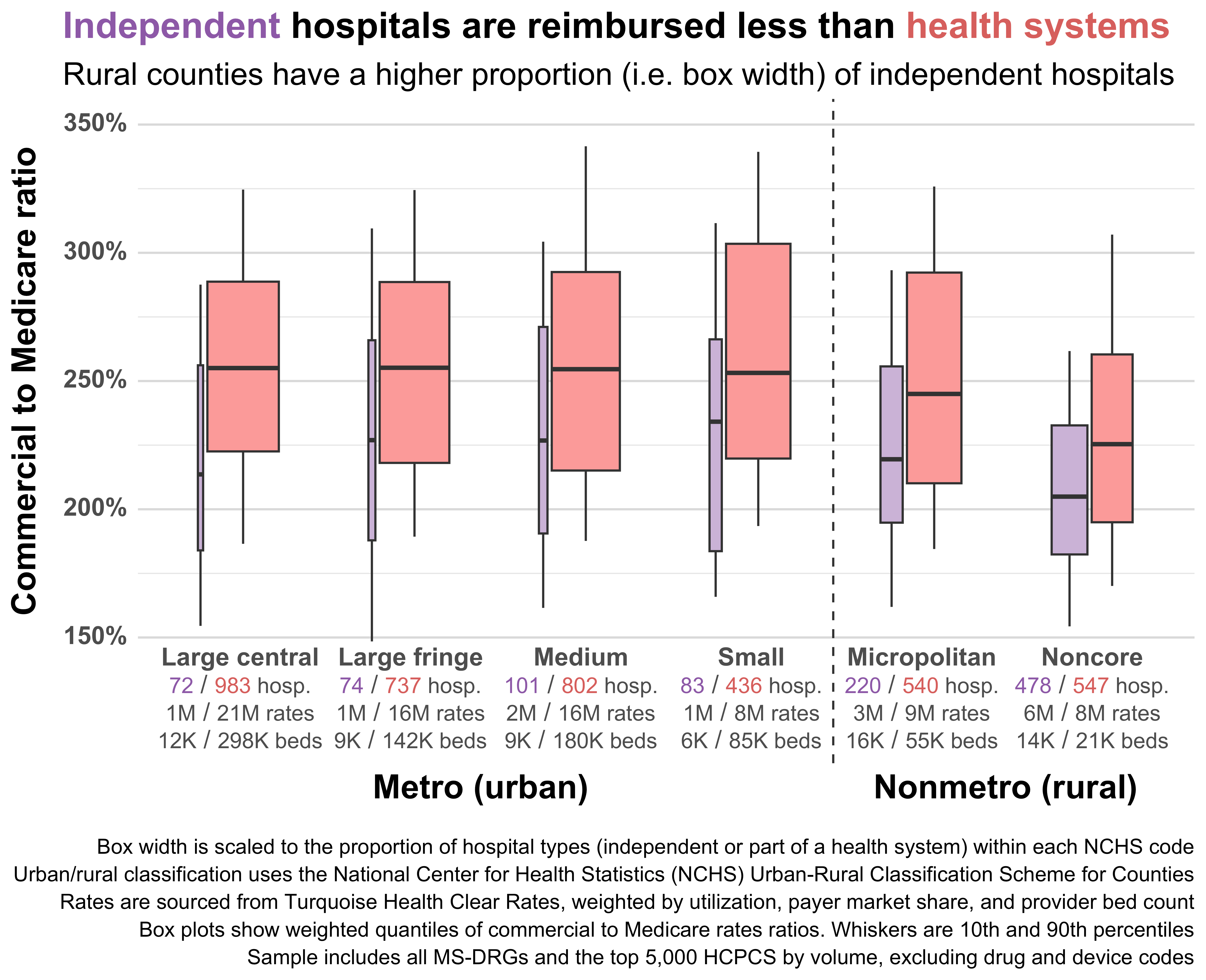 Health system affiliation is another interesting cut. Independent hospitals tend to be reimbursed at lower rates than hospitals affiliated with a health system, and rural hospitals are more likely to be independent. In practice, that means that aggregated rural reimbursement is dragged down by the high proportion of independent hospitals in rural areas, even though the gap between independent and health system-affiliated hospitals is larger in urban areas.