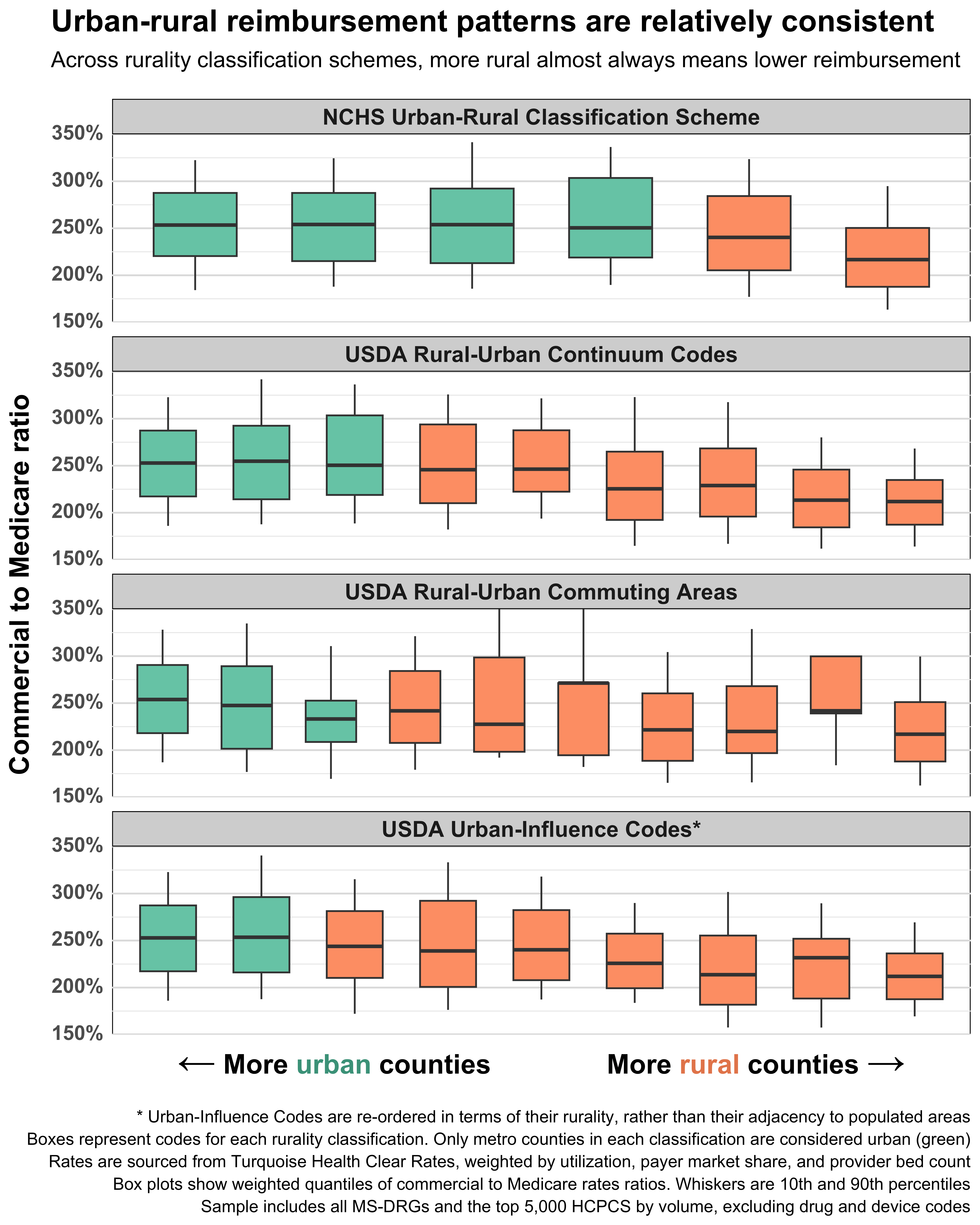 Some errant boxes aside, the trend here is unmistakable. Median commercial-to-Medicare ratios start high on the left (urban) side of the plot, then fall as you move right, toward the more rural classifications. The additional levels of rurality (compared to the two in the NCHS system) show that this drop in reimbursement is gradual and nearly monotonic – more rurality almost equals less reimbursement. Indeed, the most rural classification in each system always has the lowest reimbursement rates. The strength and clarity of this trend makes it very unlikely that the results are sensitive to the chosen classification system.