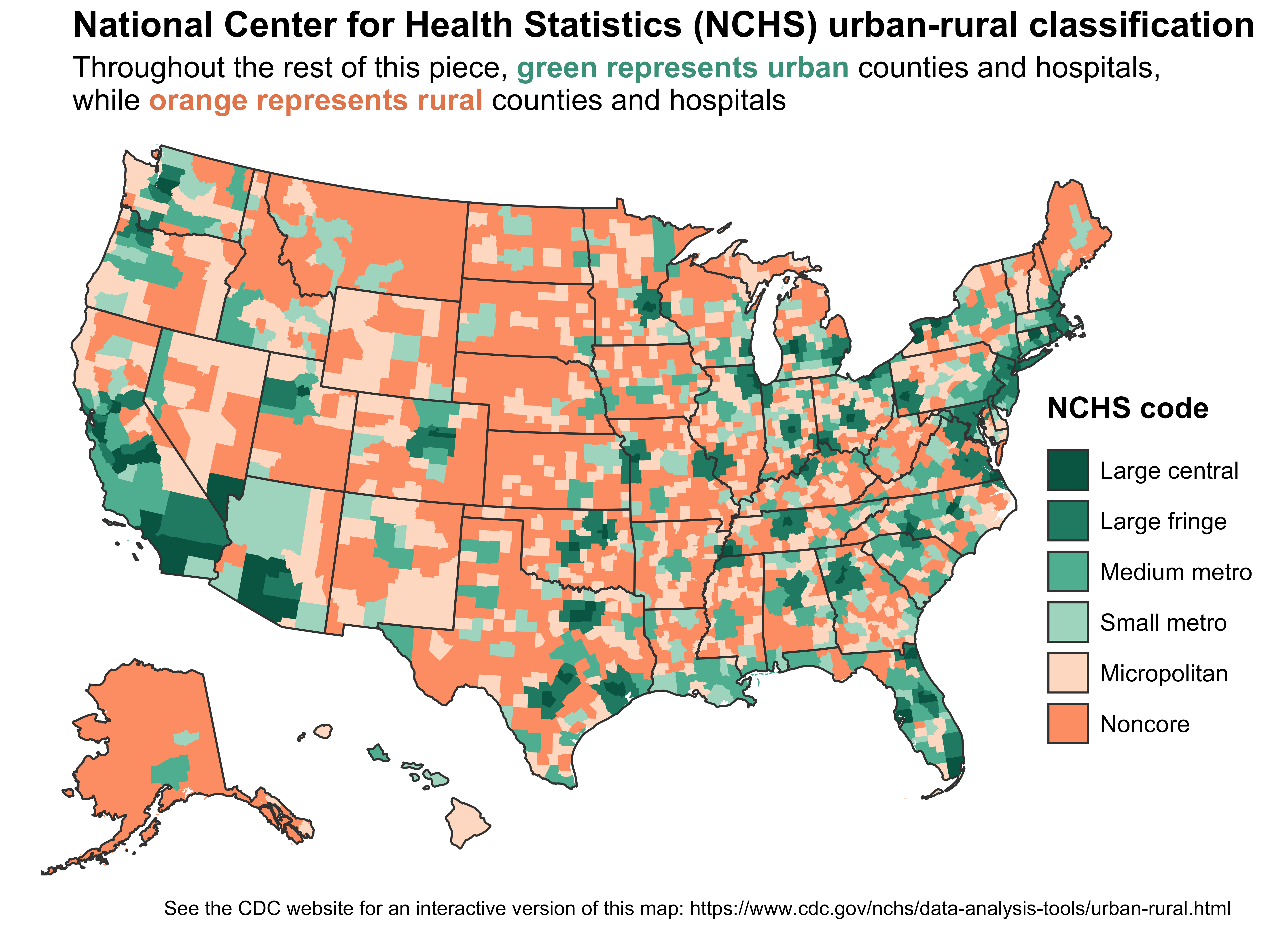 The analysis relies on a pre-made, county-level rurality classification system created by the National Center for Health Statistics. This system is based on the 2023 Office of Management and Budget (OMB) delineation of metropolitan (urban) and nonmetropolitan (rural) counties.