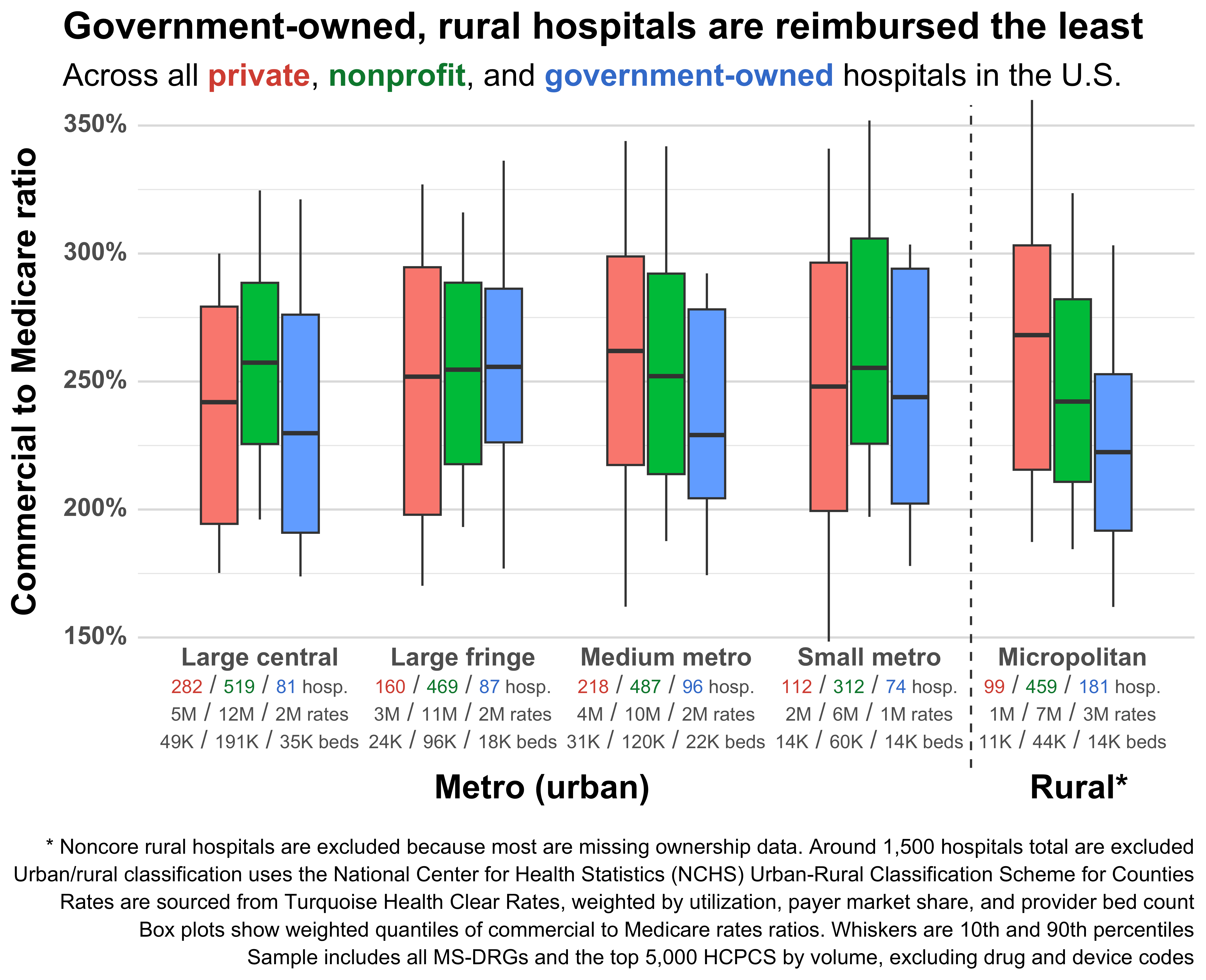 Payer mix - Rural hospitals treat more patients on Medicare than urban hospitals. Since Medicare reimbursement is (usually) lower than commercial reimbursement, rural hospitals may cross-subsidize care by hiking commercial rates. I looked for evidence of this trend, or any relationship between payer mix, rurality, and commercial prices, but didn’t find anything compelling.