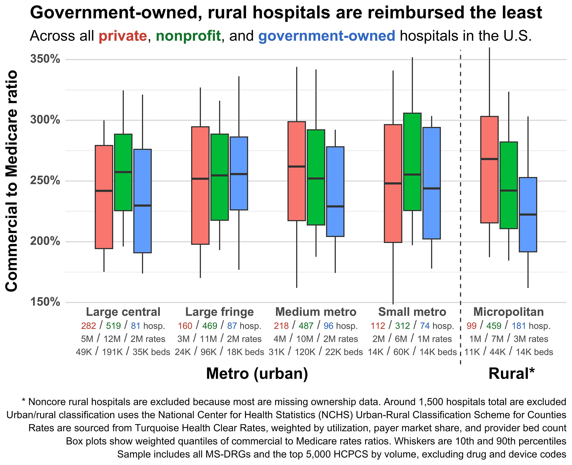 Government-owned rural hospitals have the lowest median reimbursement of any group, while private rural hospitals have the highest. Curiously, the most urban government-owned hospitals also have very low reimbursement.