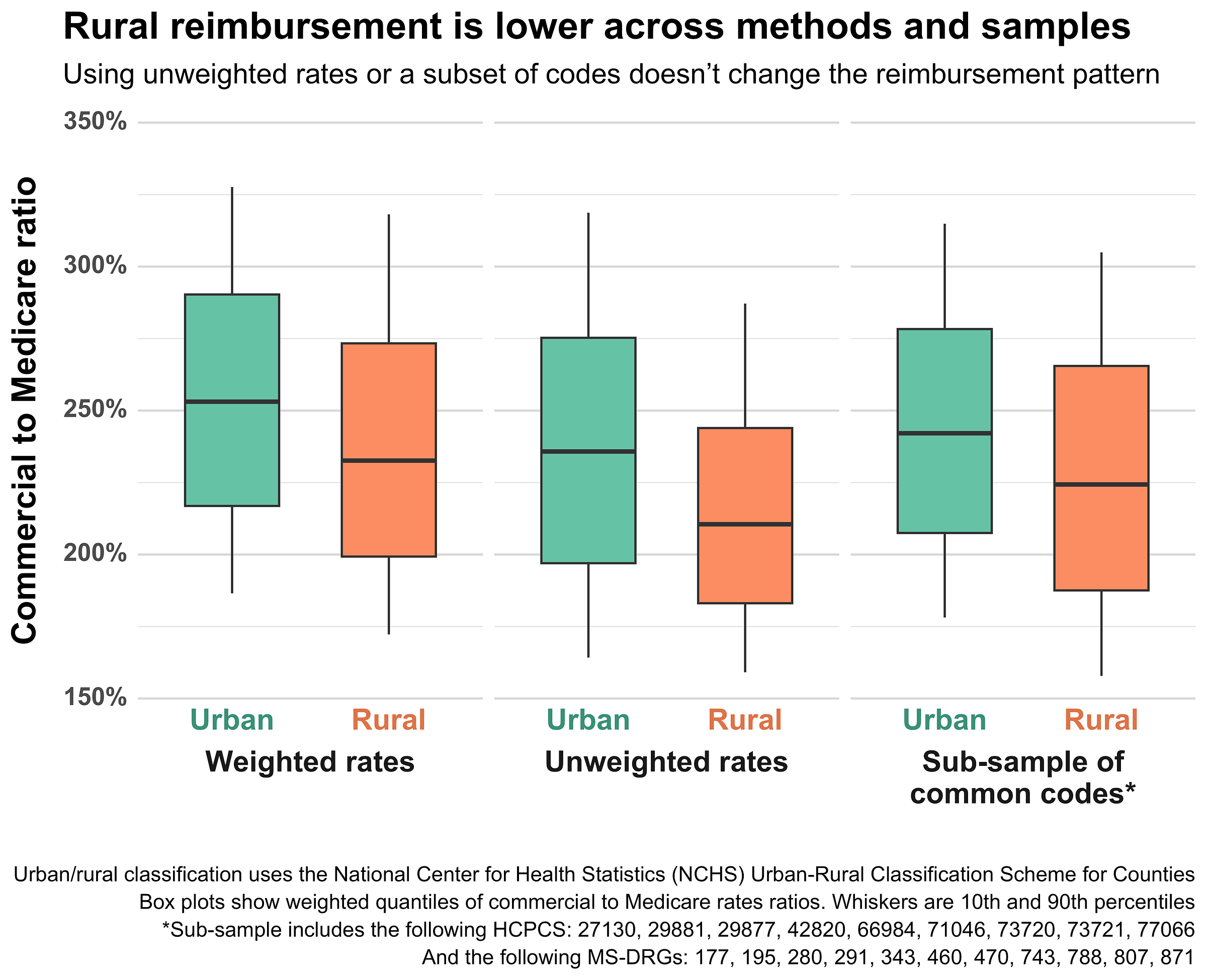 To test this effect, and to make sure that my results weren’t otherwise dependent on the mix of codes, I also ran the aggregations using a sub-sample of common procedures. The results for the sub-sample are shown in the right-most boxes above. They are slightly higher than the unweighted results, but still below the weighted ones. The gap between urban and rural providers is roughly the same. This aligns with my expectations given the sub-sample’s mix of codes, as it contains a higher proportion of inpatient rates than the main sample (and would therefore be slightly lower).